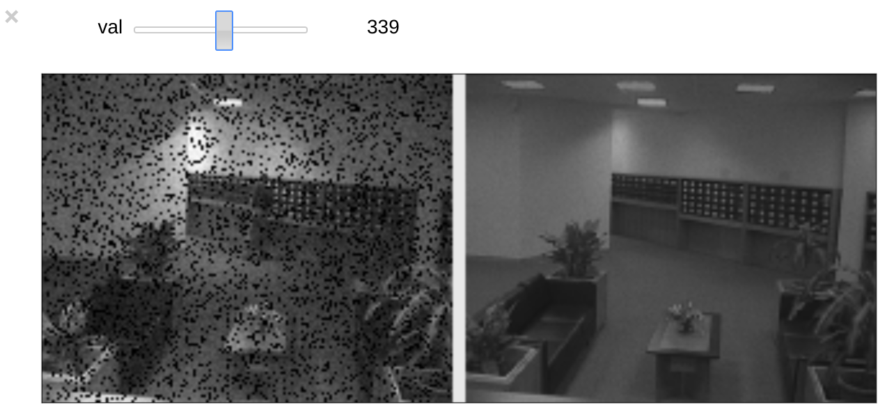 Professor Nadakuditi uses video background subtraction as a first illustration of SVD. First we view a black-and-white video as a three-axis matrix (X and Y for individual frames, Z for time). Then we reshape the video into a single matrix and take the SVD. When we reshape the first component back into video dimensions, we get the background of the scene. The remaining components contain all the motion in the video – the “high frequency” part, roughly speaking. This demo conveys the power of SVD in an intuitive way. SVD is able to cleanly isolate the background even when noise is added to the footage and some pixels are zeroed out. The demo encourages students to push SVD until it is no longer able to recover the background.