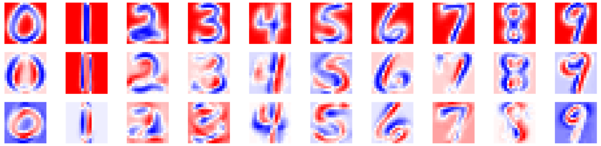 Professor Nadakuditi covers nearest-subspace classification in EECS 551. He uses a subset of the MNIST handwritten digit database to illustrate the concept. For each digit, a number of handwritten instances are grouped together, and the SVD is taken. The top $k$ components of this SVD characterize the digit’s subspace. Unlabeled test digits are then classified by determining its norm distance from each digit subspace. The nearest subspace determines the label. One powerful way to visualize what’s happening is to reason backwards: consider the top three SVD components of, say, the set of 0s in the training dataset. If we plot these components, we see that the first represents a sort of “mean 0”, the second represents a height adjustment, and the third represents width adjustment. Thus, a linear combination of these top three components yields a 0 with a particular thickness, height, and width.